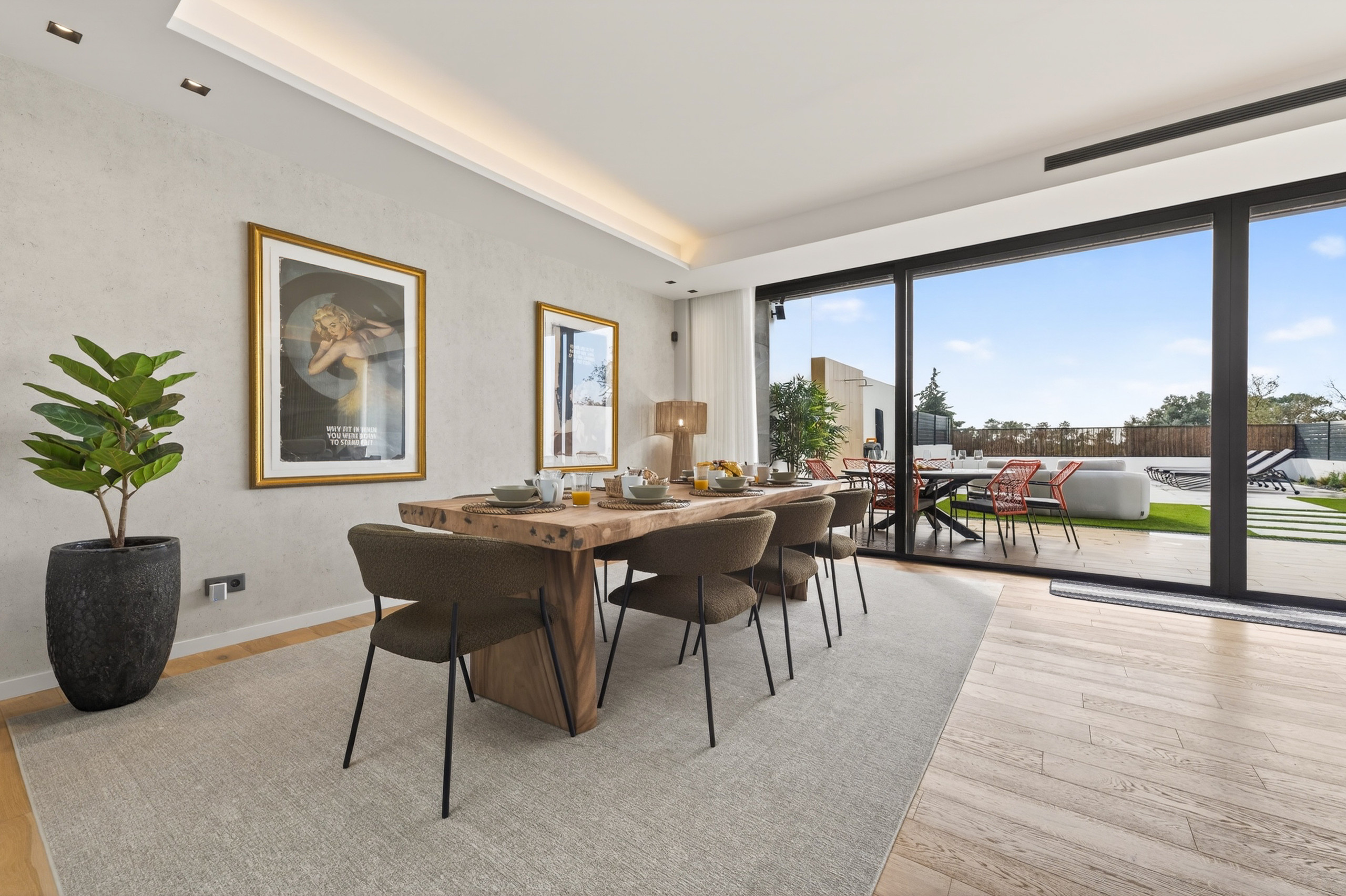 Am Ende des Flurs wird ein großer Speisesaal mit einem Tisch von beeindruckenden Ausmaßen und ein geräumiges Wohnzimmer enthüllt, ausgestattet mit einem Smart-TV, perfekt für Familienmomente. Von hier aus haben Sie Zugang zur Außenzone mit einem Esstisch und einem wunderschönen privaten Swimmingpool, ideal zum Sonnenbaden und Entspannen.