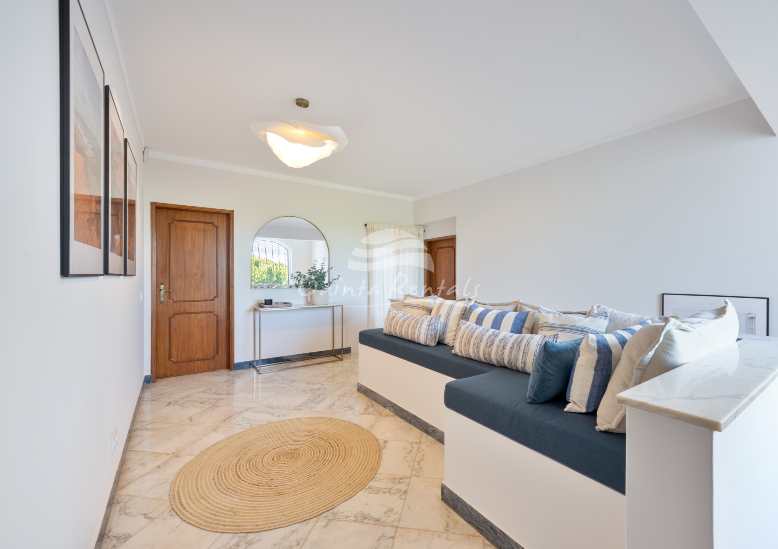 Bei der Ankunft in der Villa werden Sie von einer auffälligen blau-gelb gefliesten Treppe begrüßt, die zur Eingangstür hinaufführt. In der Villa werden Sie von der ruhigen Eingangshalle mit Bibliothek begrüßt, die Ihnen ein Gefühl von Ruhe und Entspannung vermittelt. Auf der linken Seite befindet sich ein Arbeitszimmer mit einem bequemen Sofa, das gegen einen Aufpreis pro Woche in ein zusätzliches Doppelschlafsofa umgewandelt werden kann, für diejenigen, die im Urlaub ein Büro benötigen.