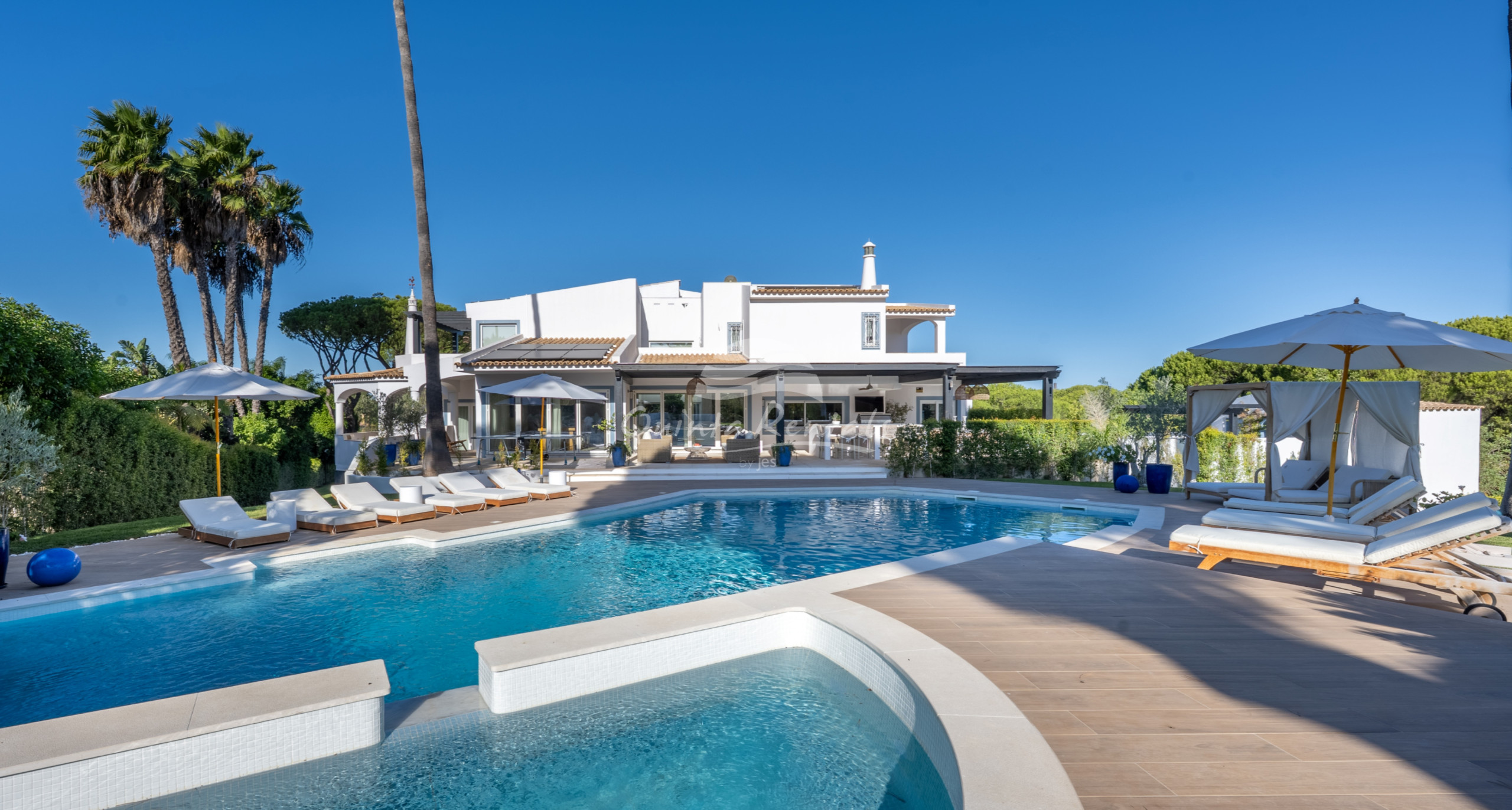 Die Villa verfügt über große Schiebetüren, die sich wunderschön öffnen lassen, um die Unterhaltungsbereiche im Freien zu beherbergen, die für die Unterhaltung gebaut wurden, mit großzügigen Ess- und Sitzbereichen, um den Pool und den Garten zu bewundern. Genießen Sie es, unter einer Bambus-Pergola zu sitzen, die mit einem atemberaubenden, blau-weiß gefliesten traditionellen portugiesischen Tisch, einem eingebauten Grill und einem Fernseher ausgestattet ist. Der große private Salz-Swimmingpool kann von der ganzen Familie genossen werden und kann für diejenigen, die das wärmere Wasser genießen, beheizt werden.