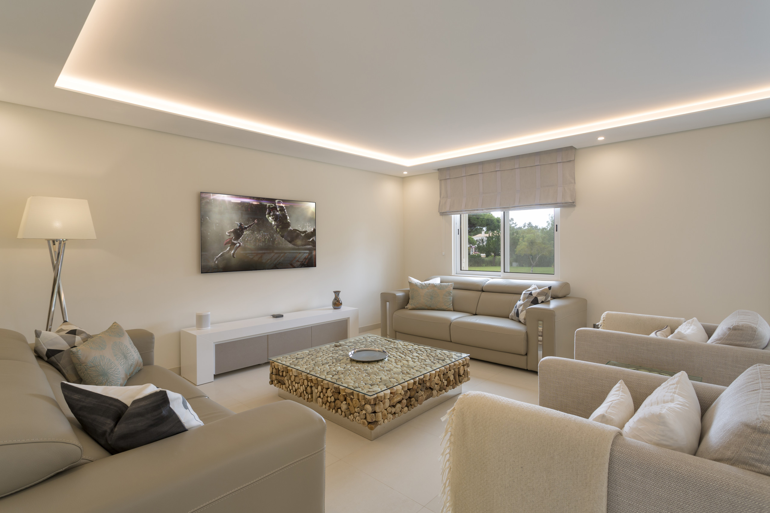 L'espace spacieux et élégant en open space, qui intègre le salon, la salle à manger et la cuisine équipée d'appareils à écran tactile, en plus d'autres luxes modernes et discrets, offre tout ce dont vous avez besoin pour vous détendre confortablement, dans une décoration aux tons neutres et sophistiqués.