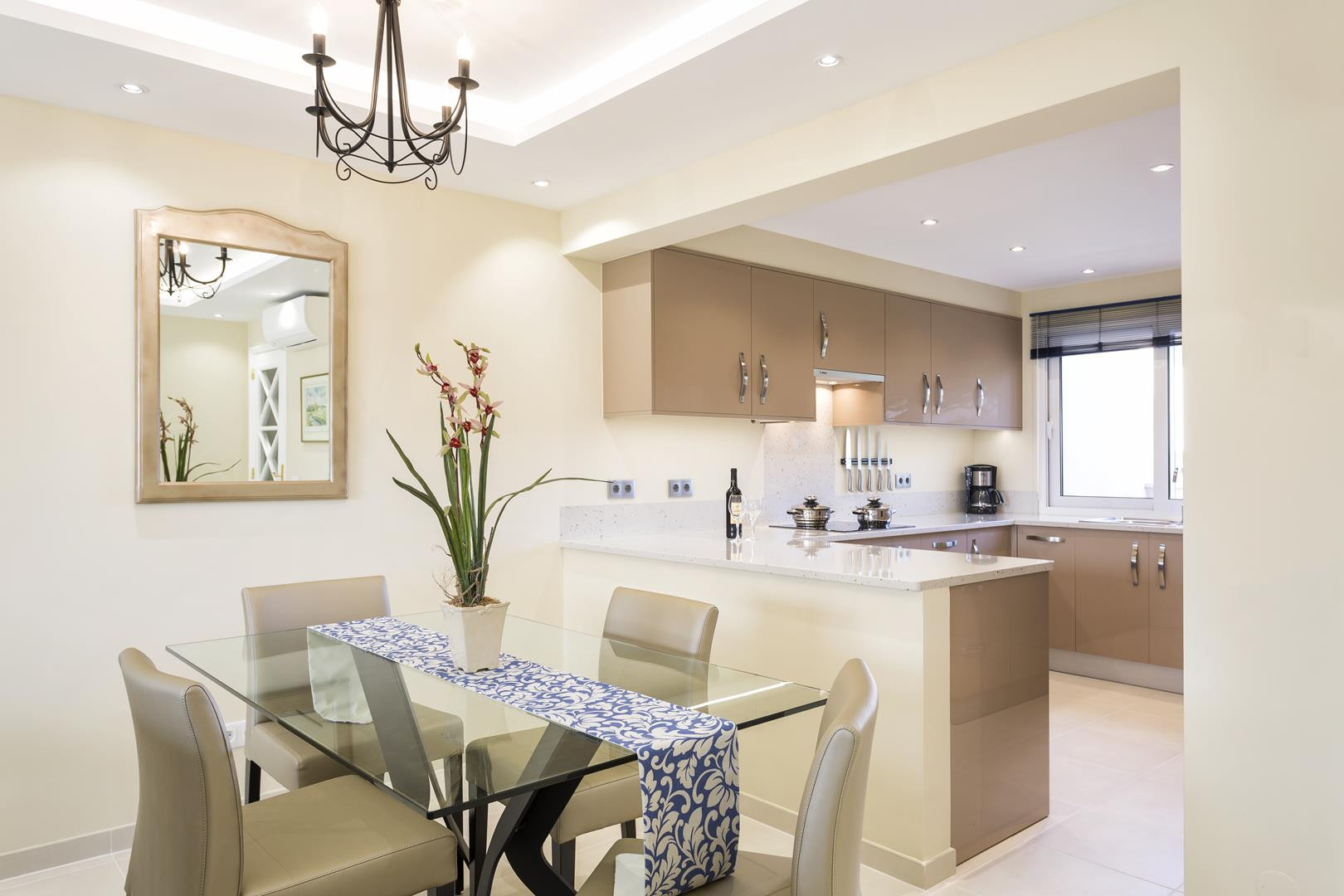 A espaçosa sala de estar em planta aberta e a cozinha totalmente equipada estão elegantemente mobiladas em tons neutros, criando uma atmosfera calma e relaxante para desfrutar durante a sua estadia no Algarve.