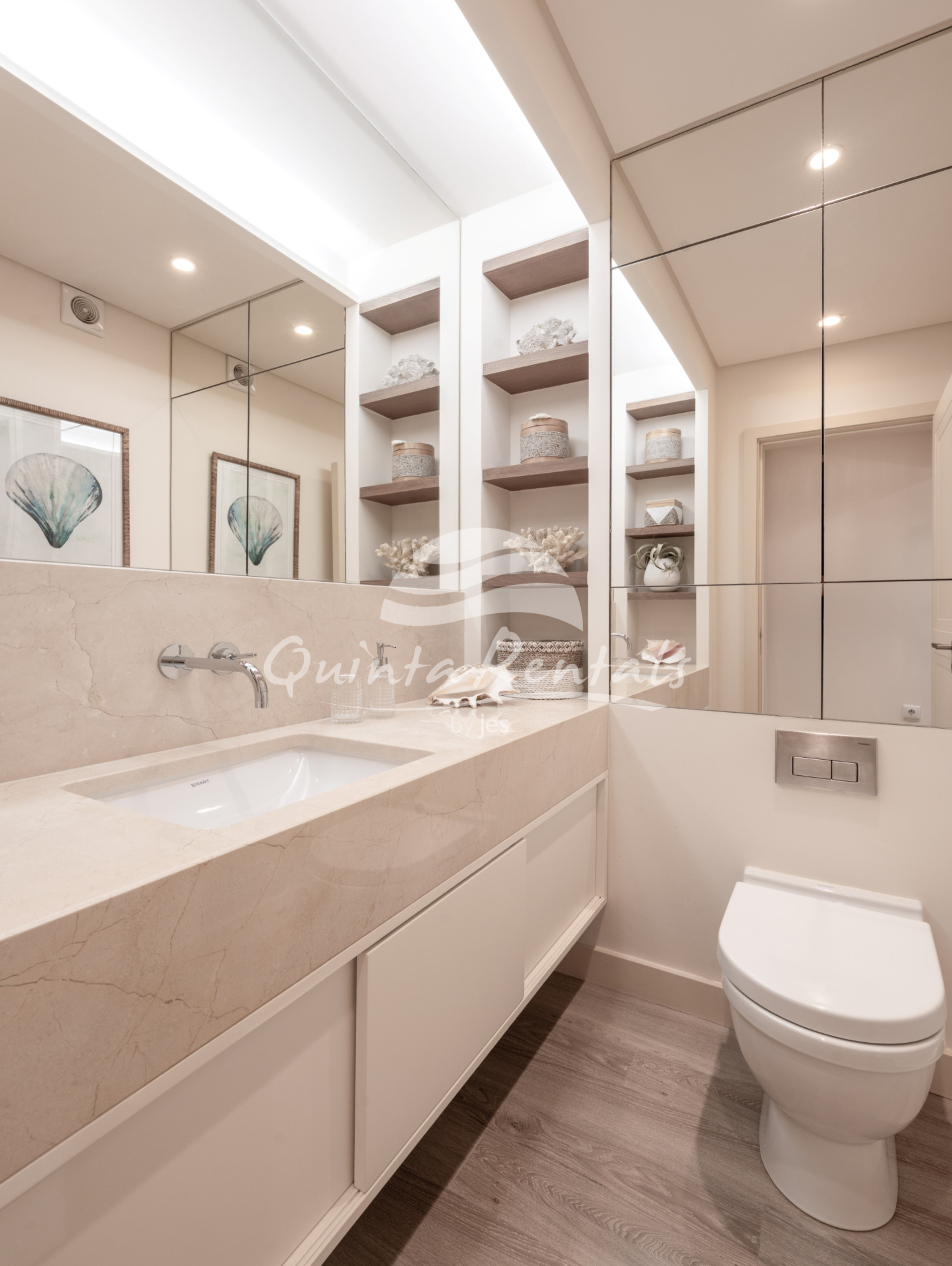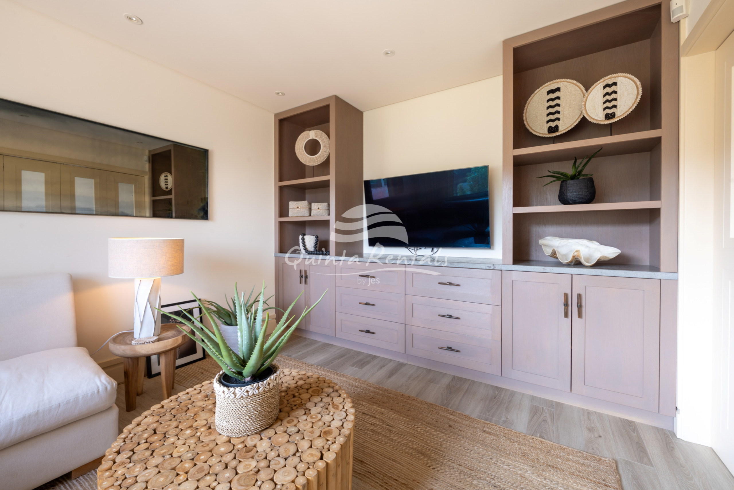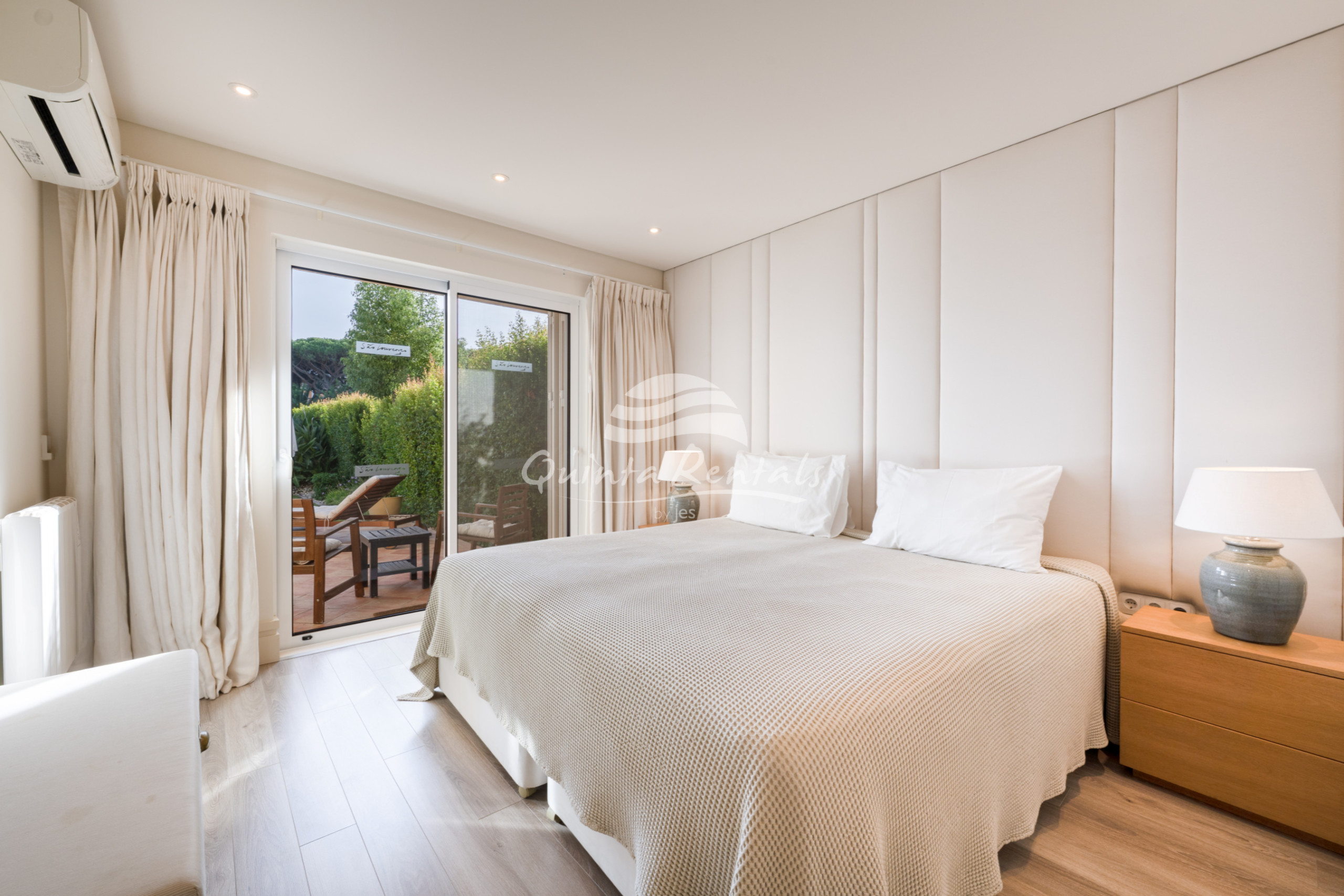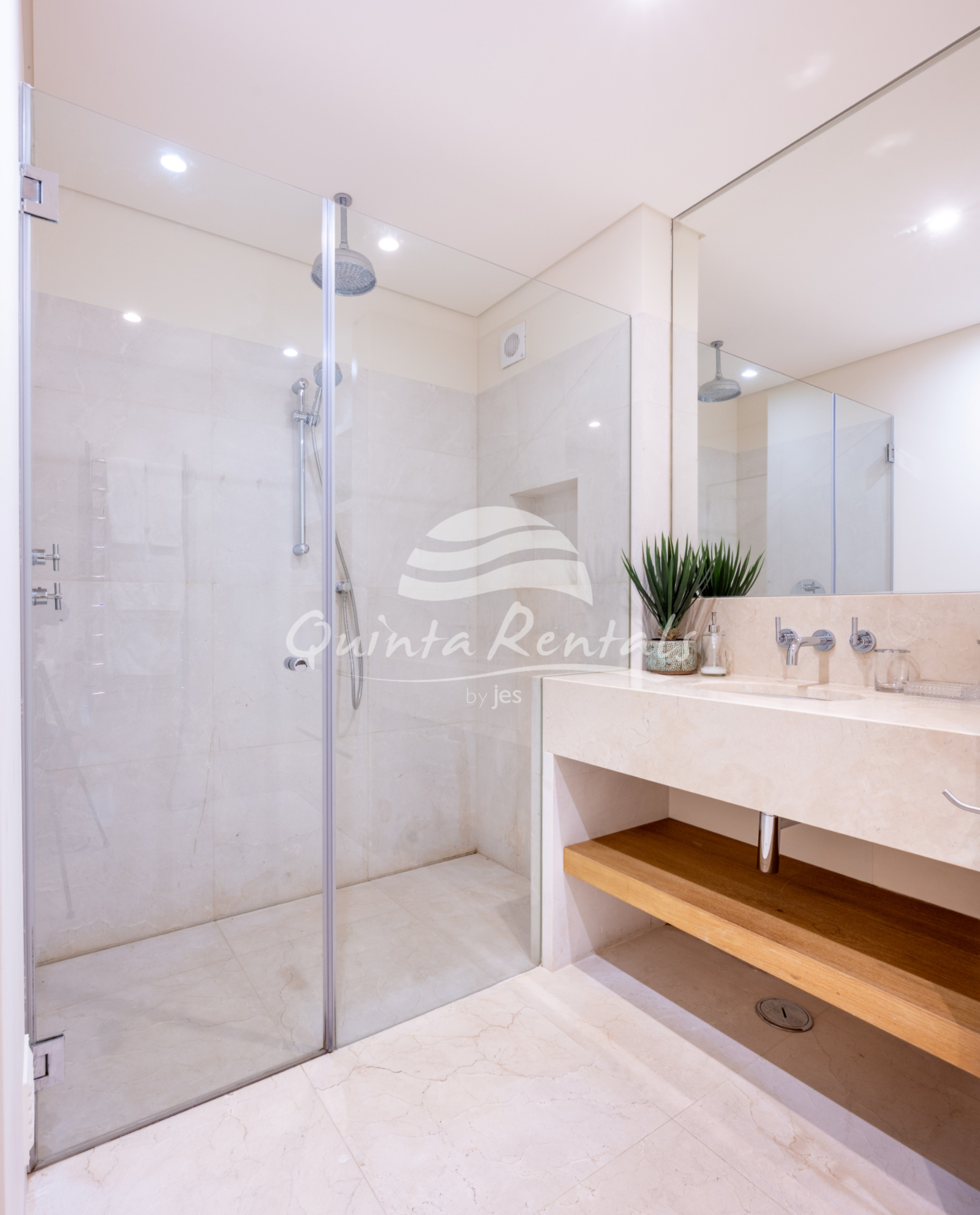 Descendo as escadas, chegará ao rés-do-chão do apartamento, onde encontrará duas suites luxuosas com acesso ao jardim privado verde e tranquilo, ideal para desfrutar do sol quente do Algarve.