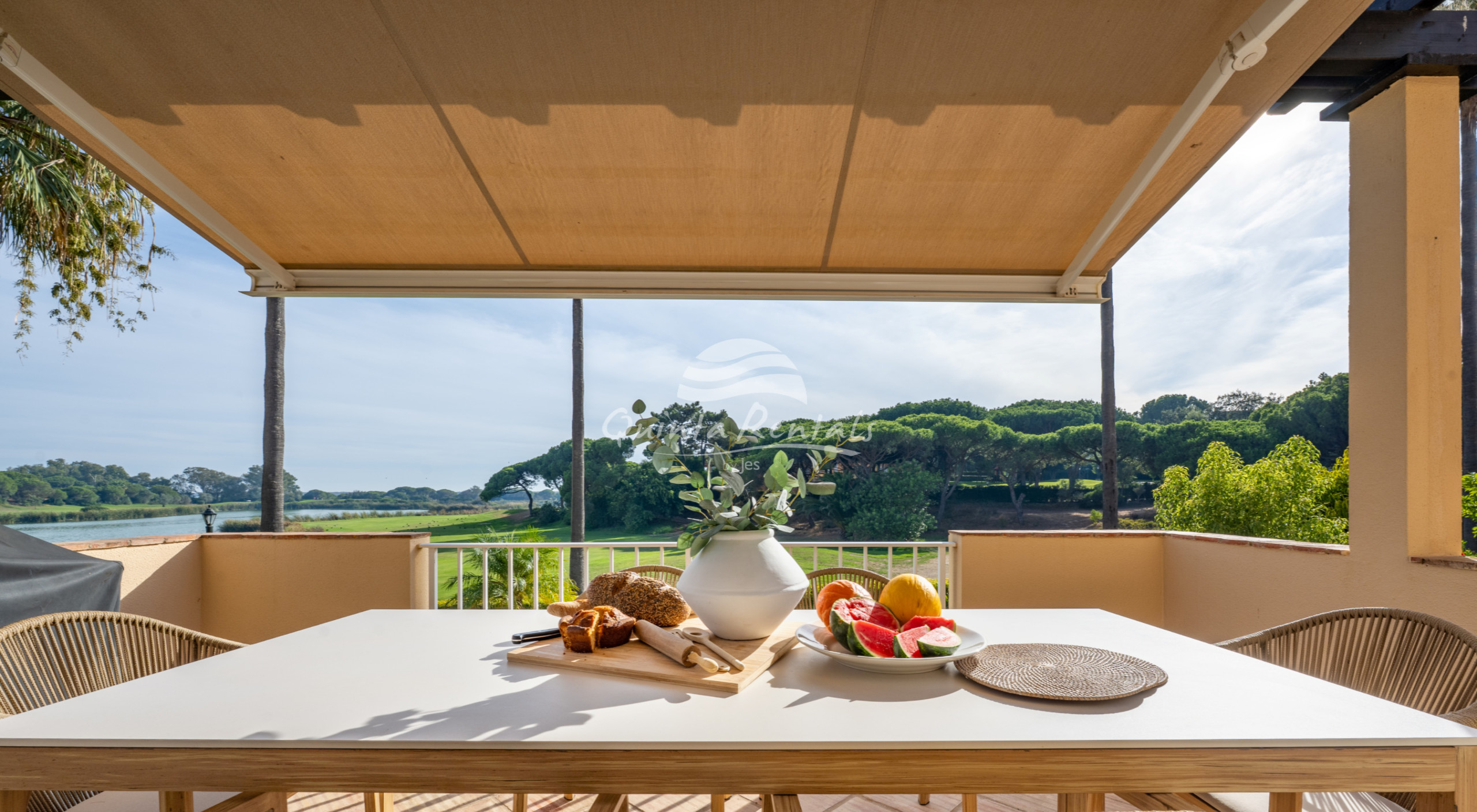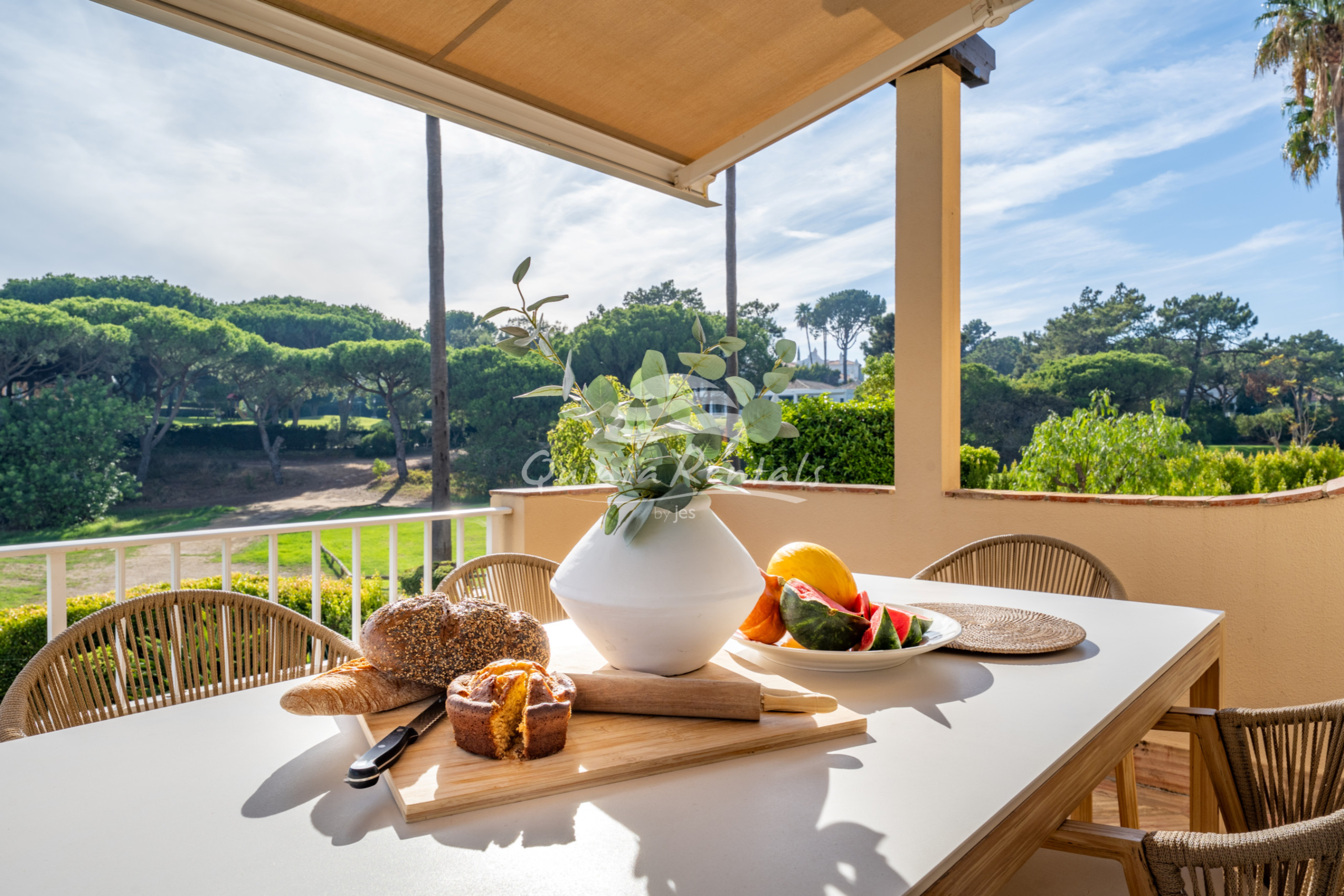 O apartamento tem vistas panorâmicas requintadas sobre a área da piscina comum, o lago e o campo de golfe.