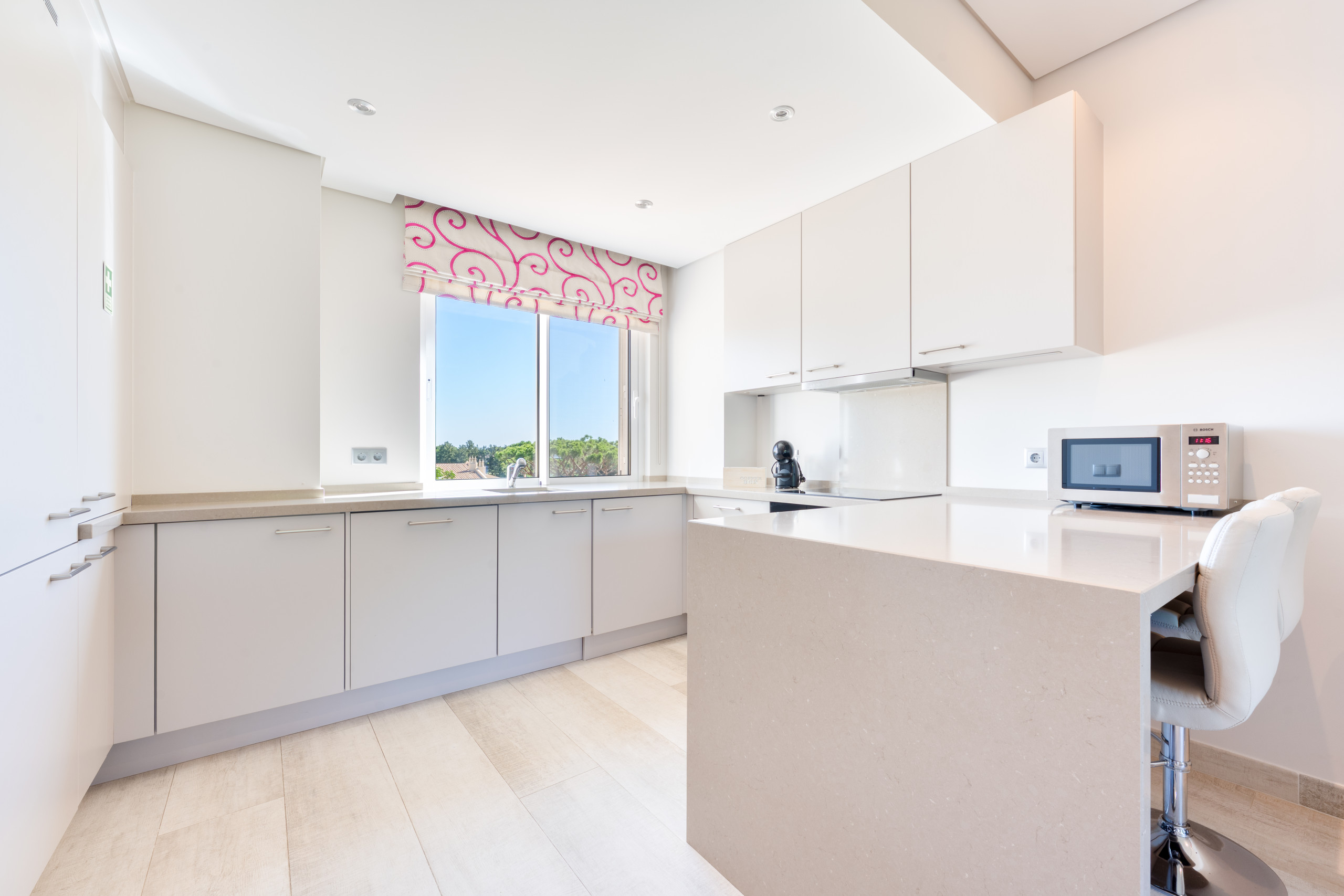 Ao entrar nesta penthouse elegantemente mobilada, a partir da acolhedora cozinha totalmente equipada, que tem um delicioso recanto para o pequeno-almoço com vista para a zona de lazer, entra-se numa varanda com vista para o jardim deslumbrante e para o campo de golfe.
