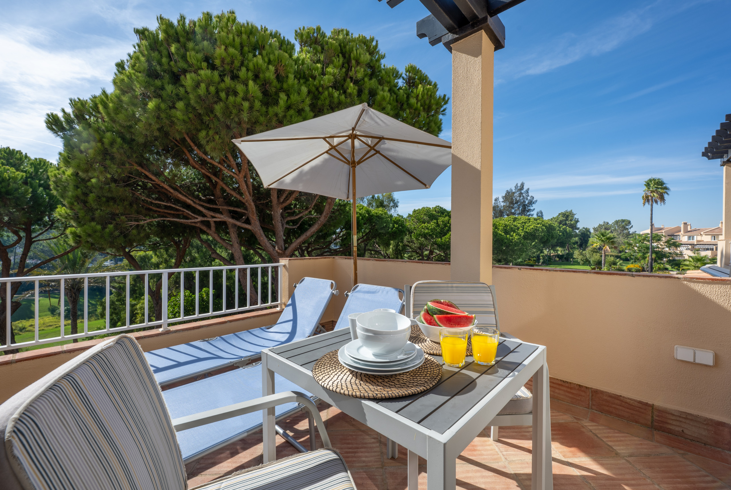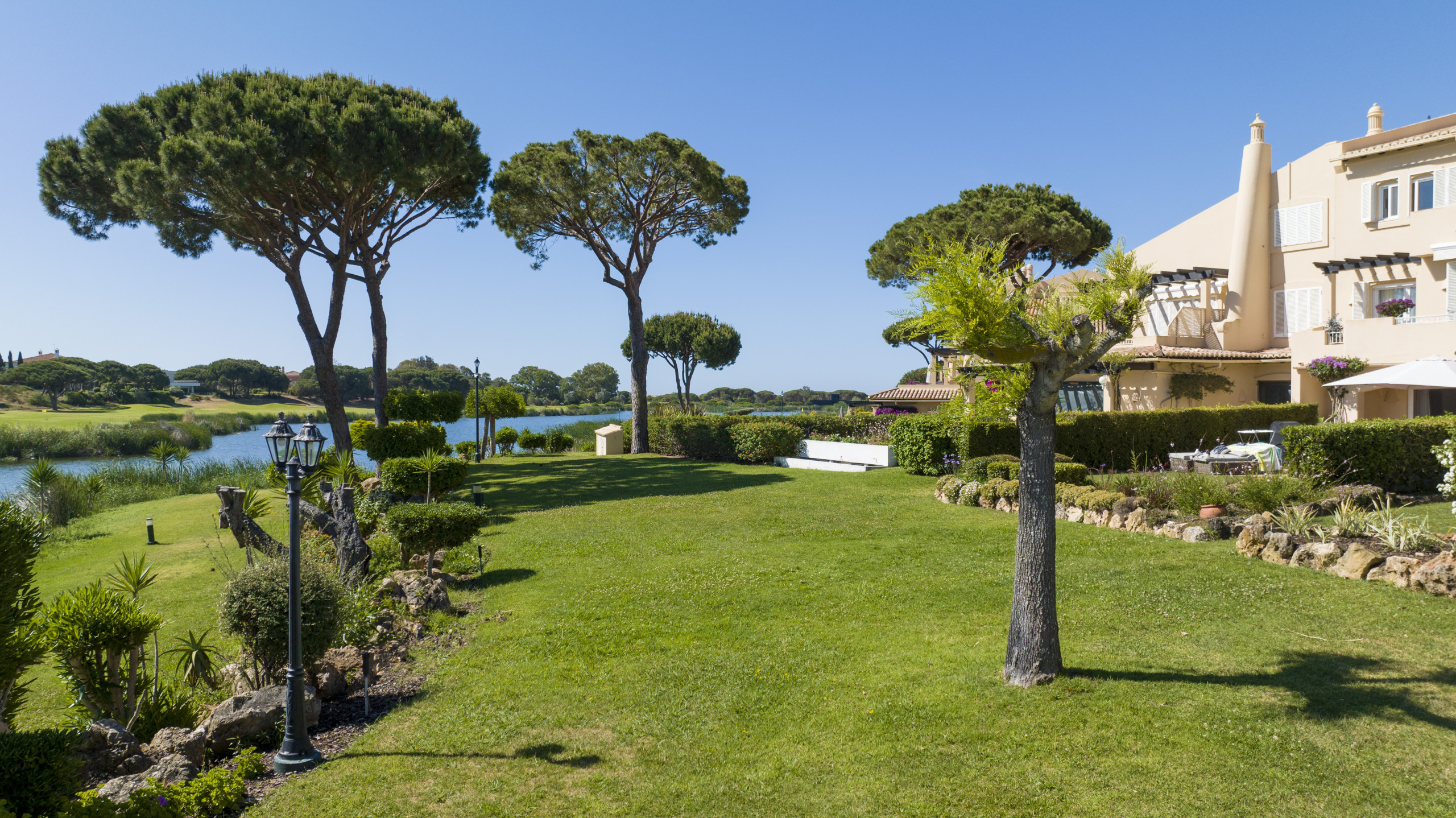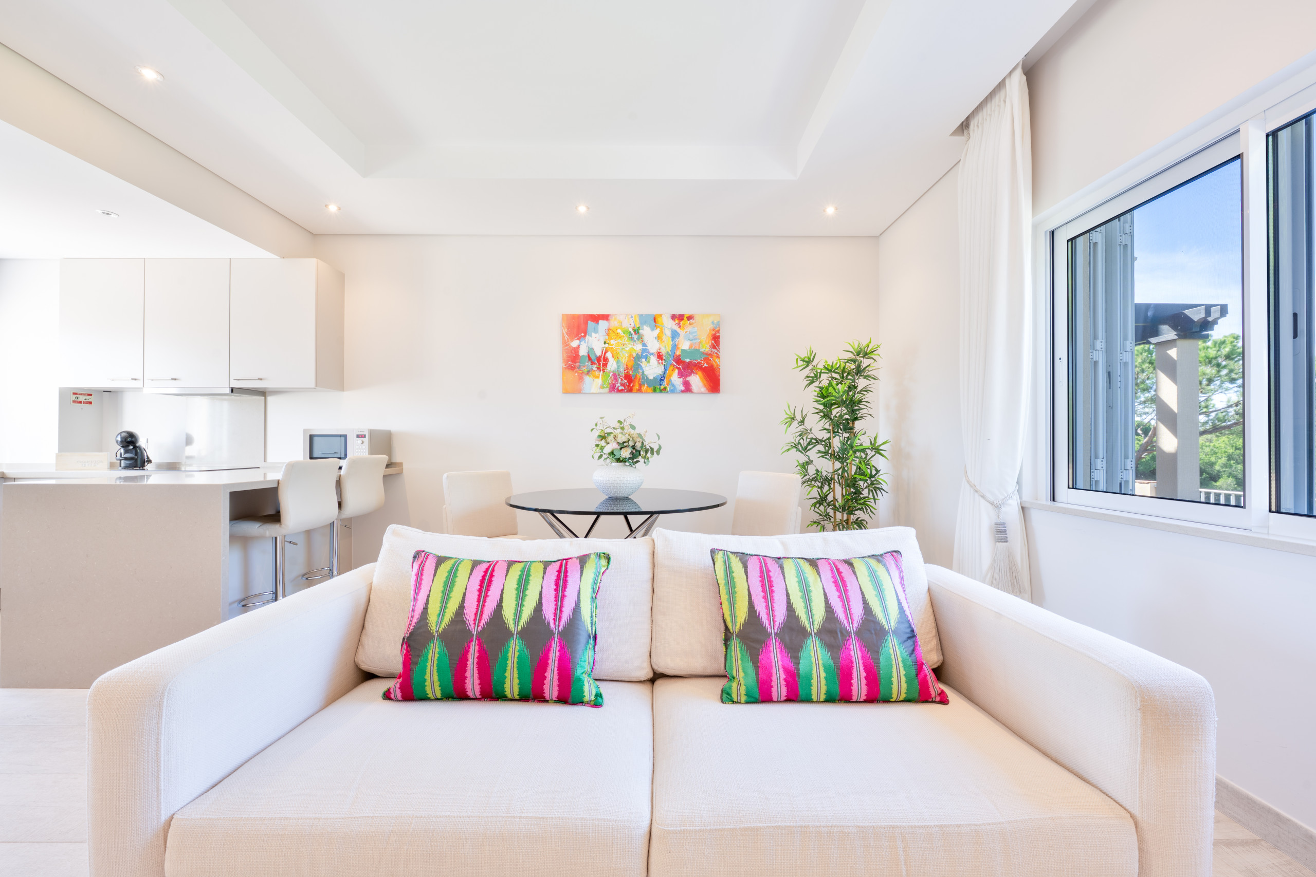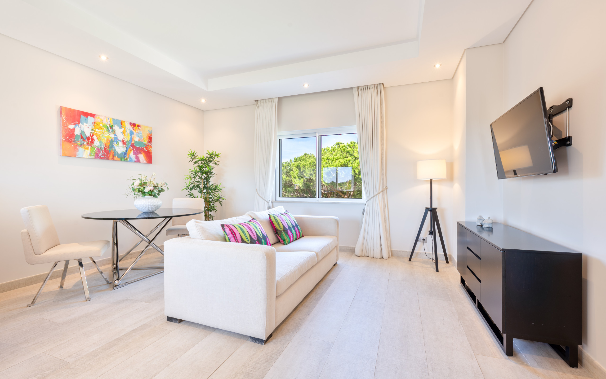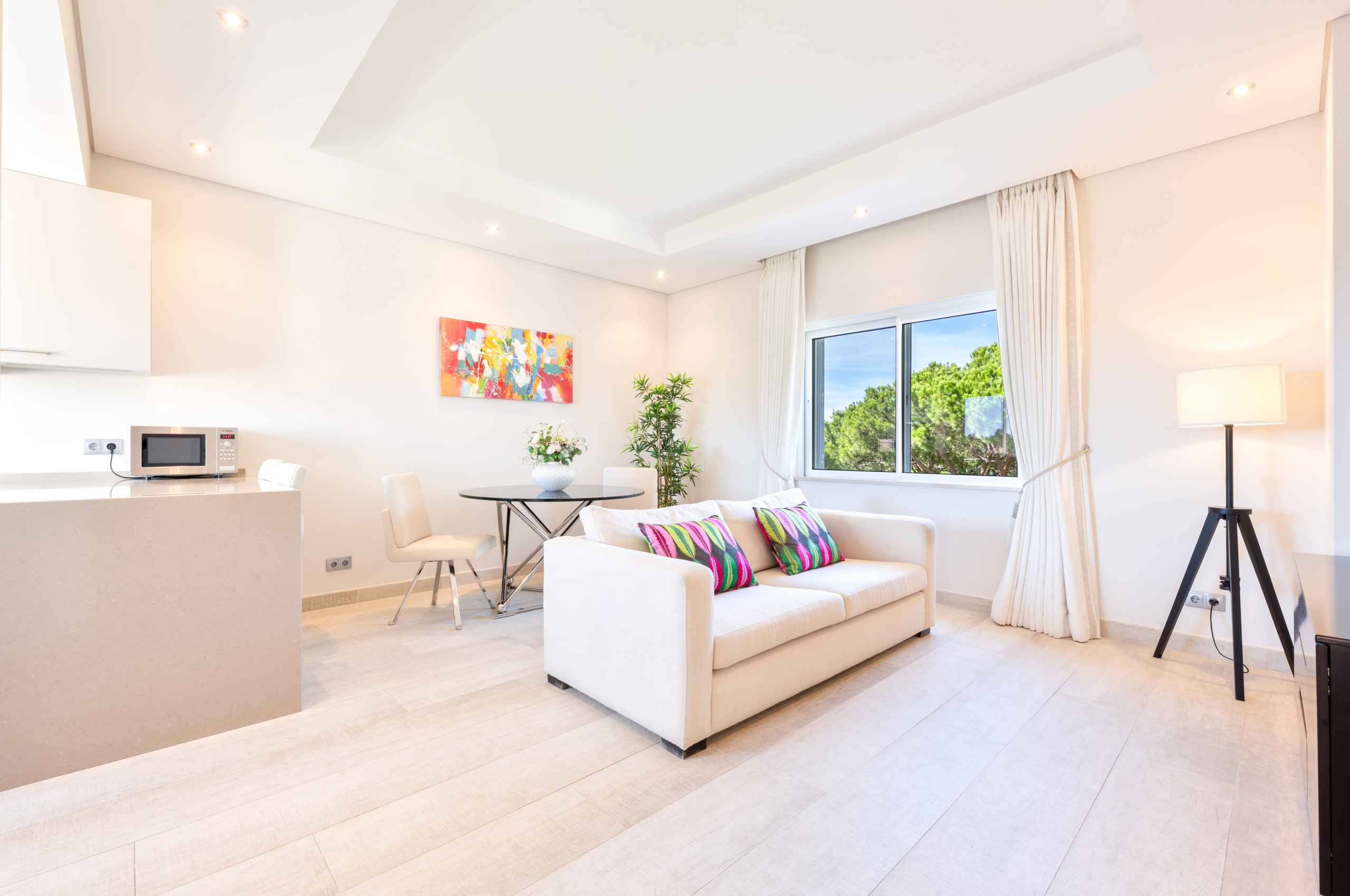 O apartamento tem uma charmosa vista sobre os verdejantes jardins comuns, que se fundem com o campo de golfe de São Lourenço.