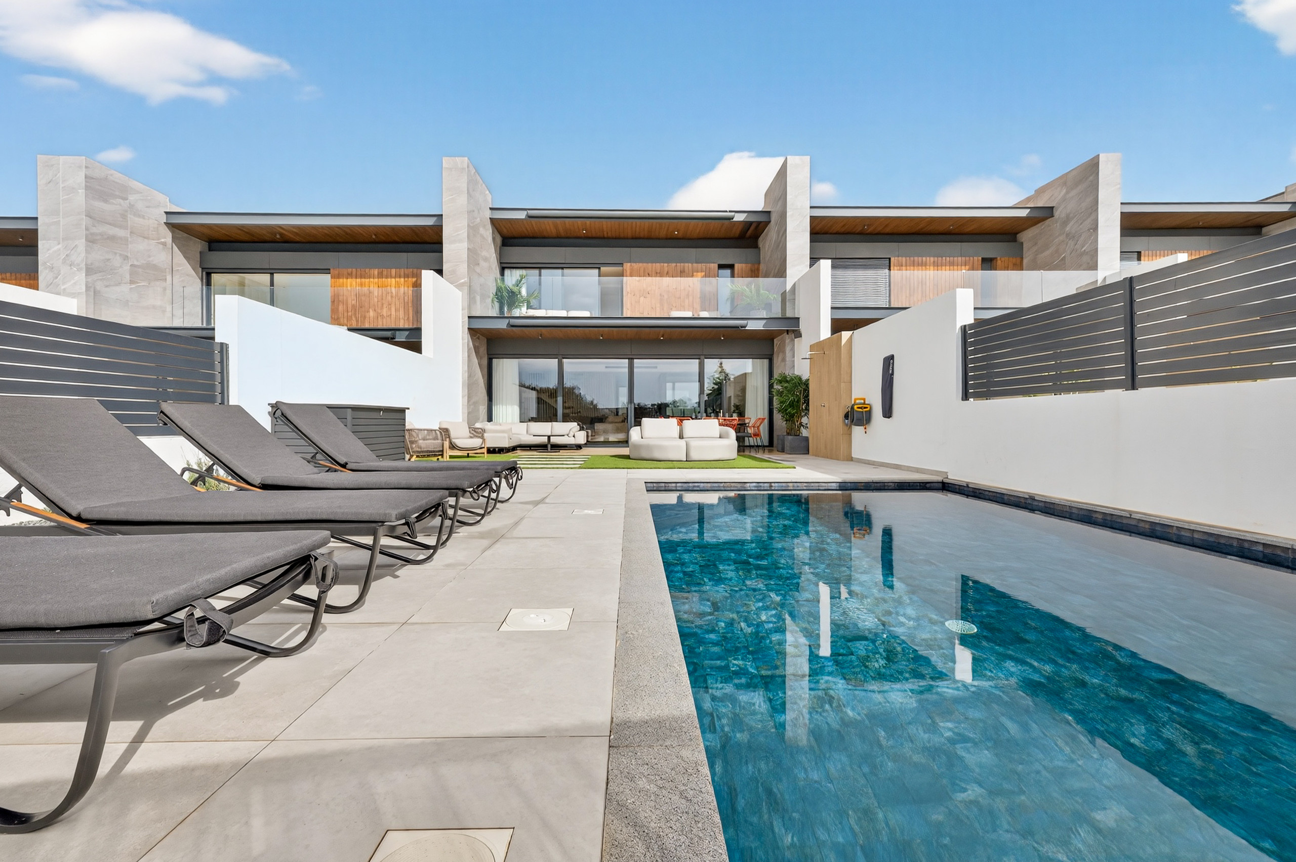 Ao fundo do corredor, será revelada uma ampla sala de jantar com mesa de grandes dimensões e uma sala de estar espaçosa, equipada com Smart TV, perfeita para momentos em família. A partir daqui, terá acesso à zona exterior, com mesa de refeições e uma bela piscina privada, ideal para relaxar ao sol.