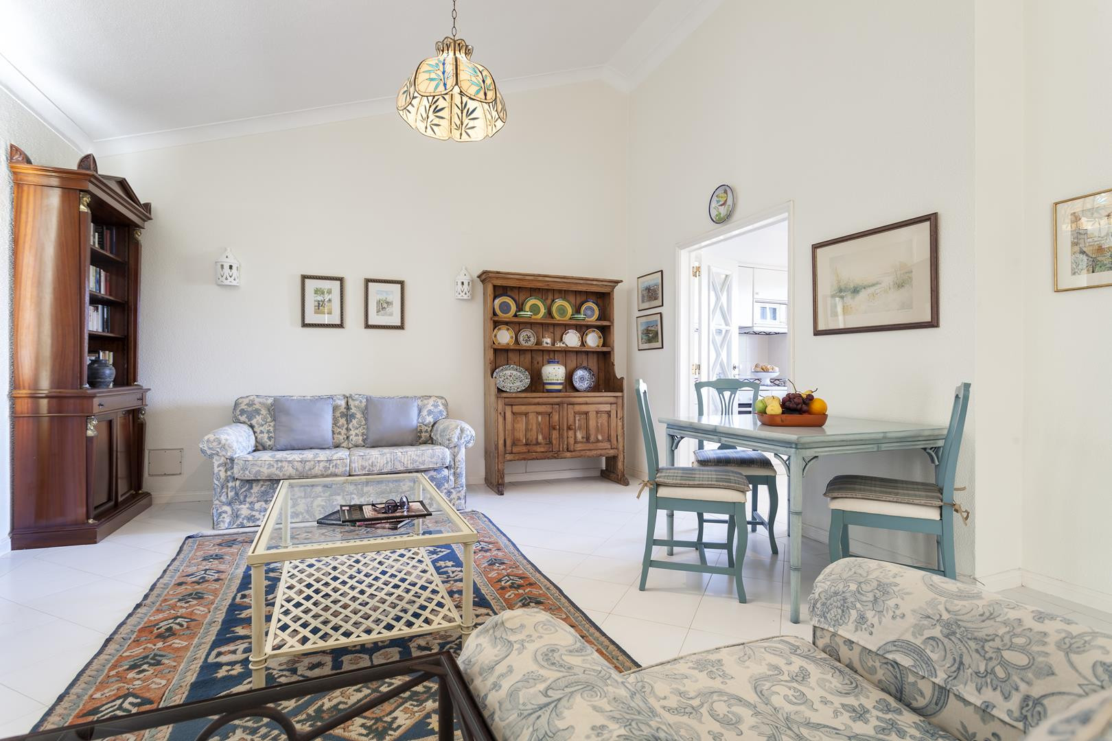 This comfortable apartment is decorated in a typical traditional style, and it boasts high ceilings and cool textiles for the warmer days and a nice fireplace for those cozy winter months.