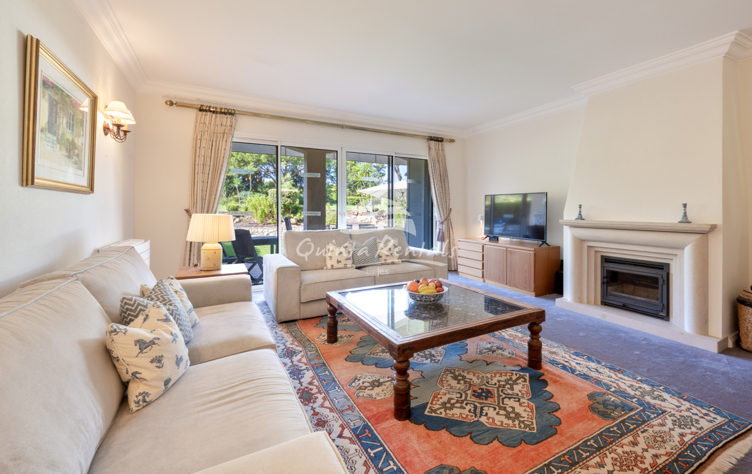 The apartment has charming views over the lush, green communal gardens that fade into the São Lourenço golf course.