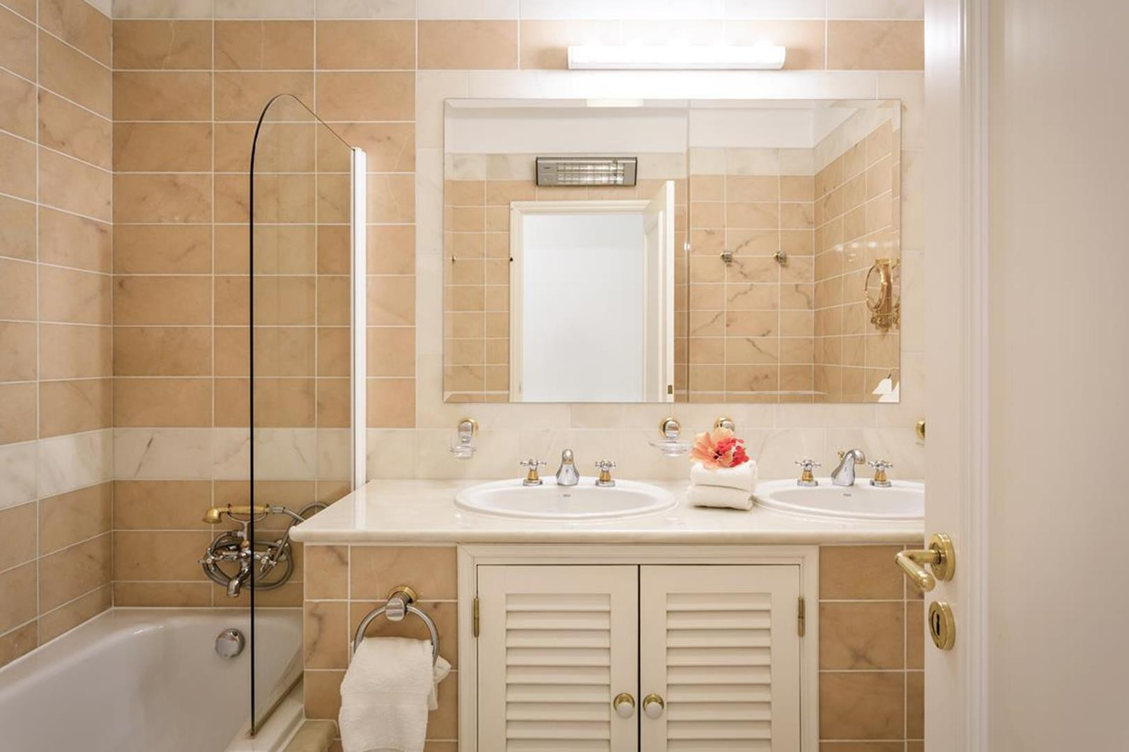 Once you enter the apartment you will find the fully equipped kitchen to your left, with marble counters and modern appliances. The open space living area has a round glass dining table and comfortable sofas, as well as a cosy fireplace and wine rack.