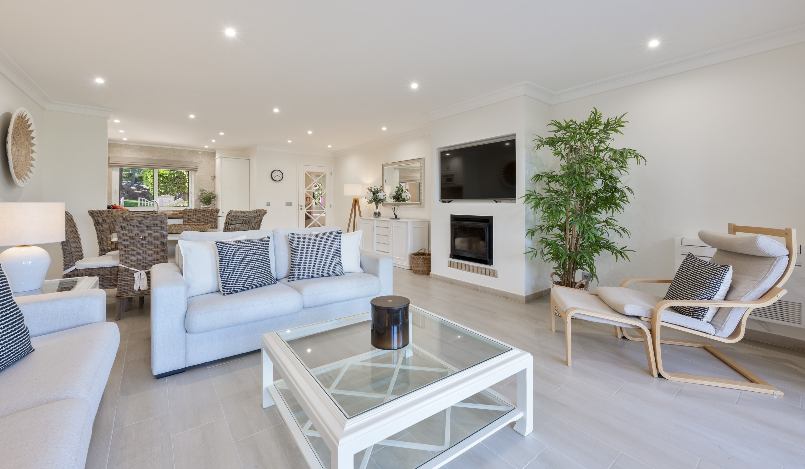 The open-plan kitchen, fully equipped, extends into the modern living/dining room, subtly painted and decorated with calm and relaxing colours.