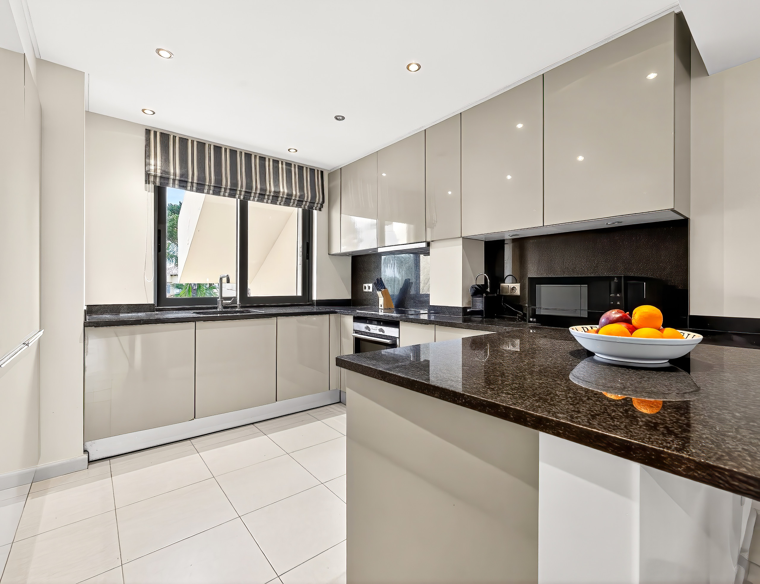 The open-plan kitchen, fully equipped, extends into the modern living/dining room, subtly painted and decorated with calm and relaxing colours.